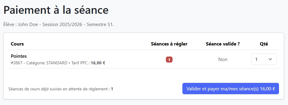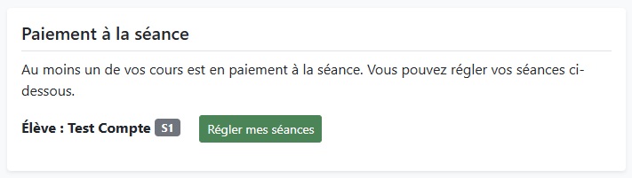 Si vous avez choisi le paiement à la séance pour un ou plusieurs cours, un bouton « Régler mes séances » sera disponible sur la page d’accueil de votre espace personnel.