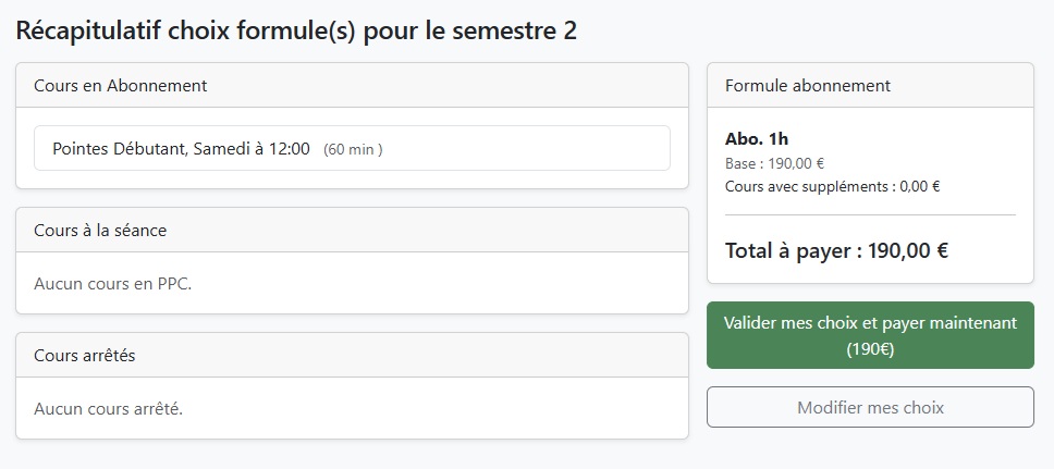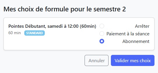 Si vous avez choisi Paiement à la séance, un message de confirmation validera votre choix. Ensuite, suivez l’étape 5 pour régler vos séances avant les cours.